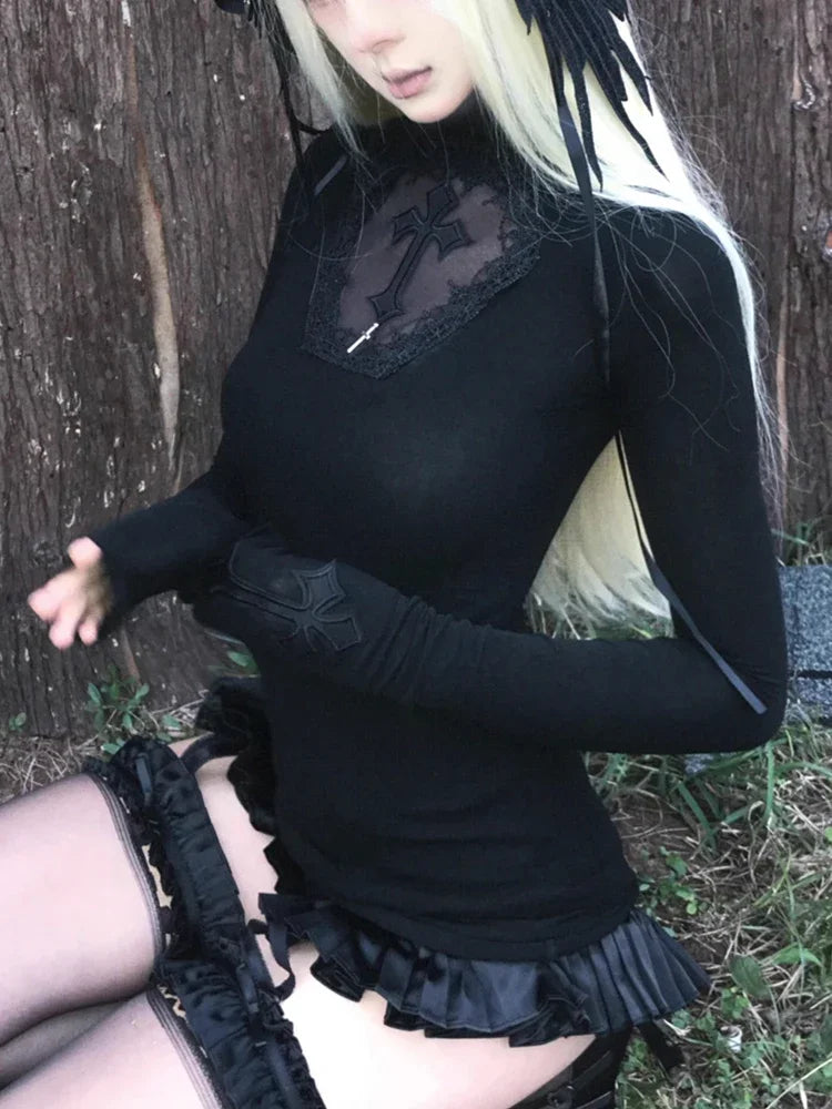 AltGoth Mall Goth Cross T-shirt Women Dark Punk Hotsweet Sexy Lace Patchwork Long Sleeve Tee Tops Emo Alternative Basic T-shirts