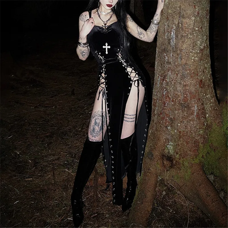 Goth Dark Punk Grunge High Split Hem Straps Dess 90s Streetwear Gown Women Sexy Corn Bandage Velvet Dresses Mall Gothic Clothing
