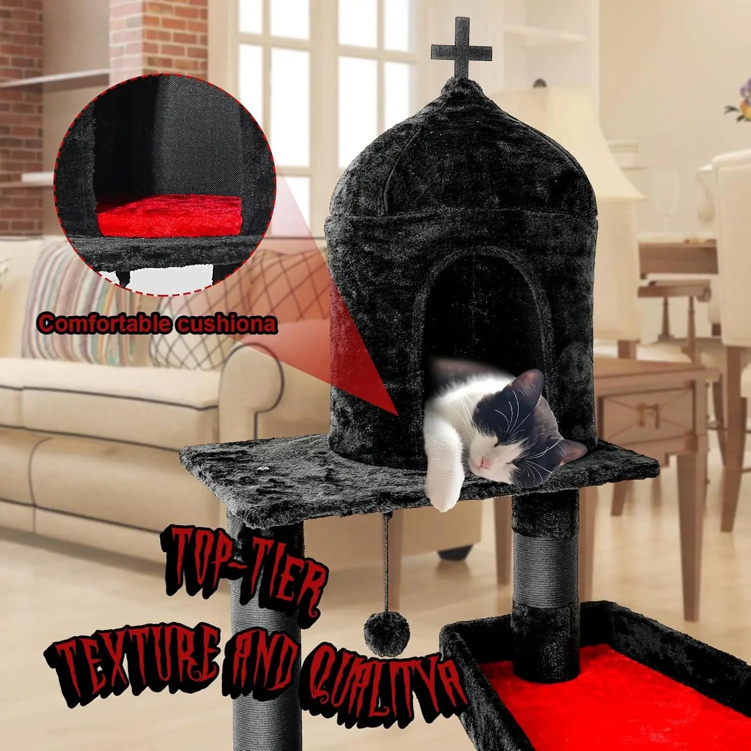 Gothic Cat Tree with Coffin Bed, 55" Goth Cat Tower with Spacious Cat Condo, Scratching Posts, Hanging Spider, Hammock,