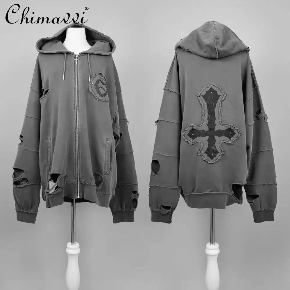 Japanese Mine Cross Ripped Retro Subculture Hooded Sweatshirt Cardigan Jacket Women's Goth Punk Zipper Hoodie Coat Outwear