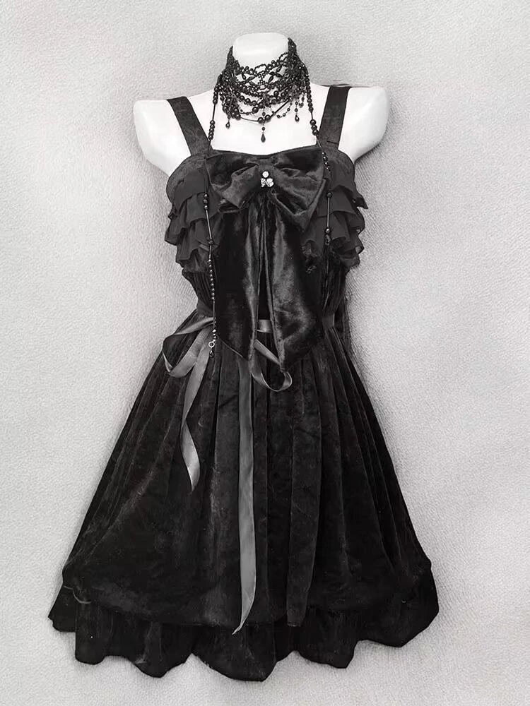 Summer Gothic Retro Lolita Dress Set Women Casual Black Short Cardigan + Y2k Vintage Bow Mini Dress Elegant Fashion 2 Piece Set