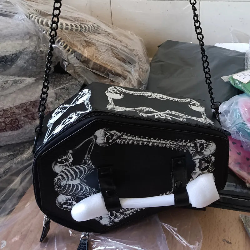Trend Punk Style Skeleton Coffin Bag Gothic Bat Single Shoulder Bag Black PU Leather Purse Crossbody Bag